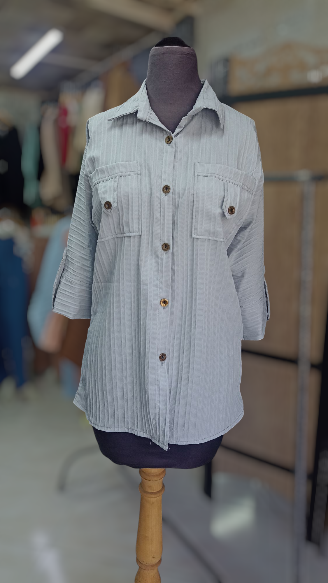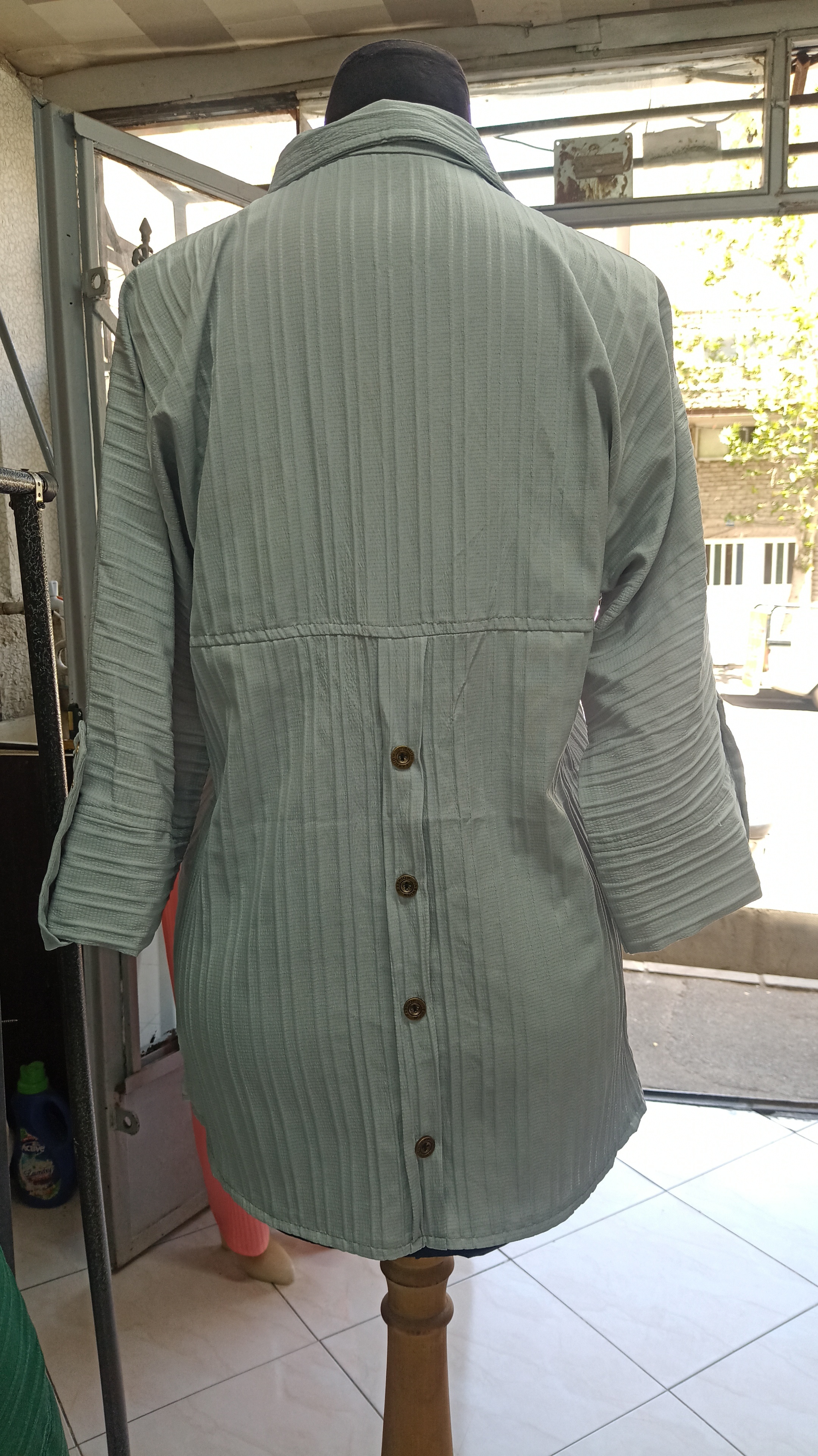 آستین سه ربع و پاگون دارمیباشد پشت شومیز برای زیبایی دکمه نما کارشده